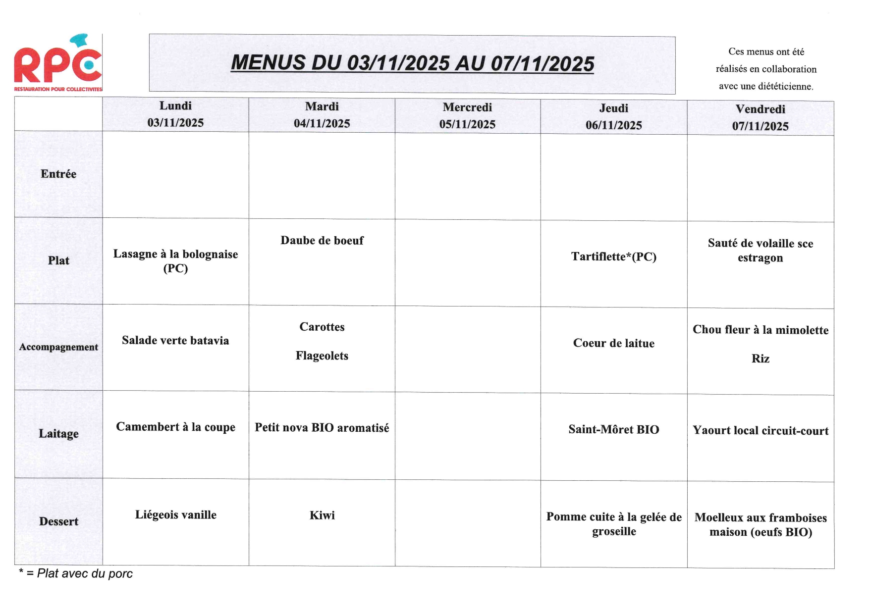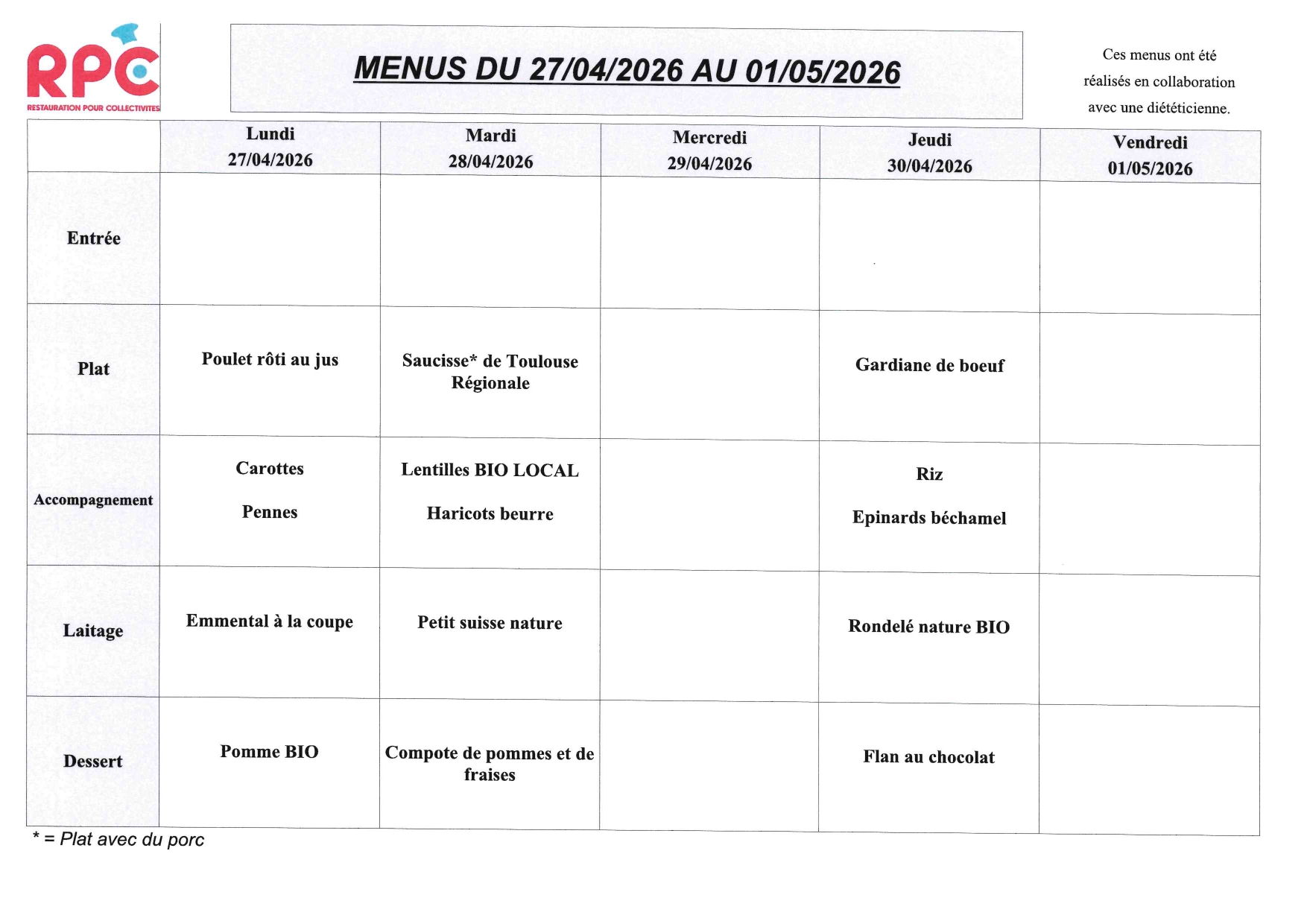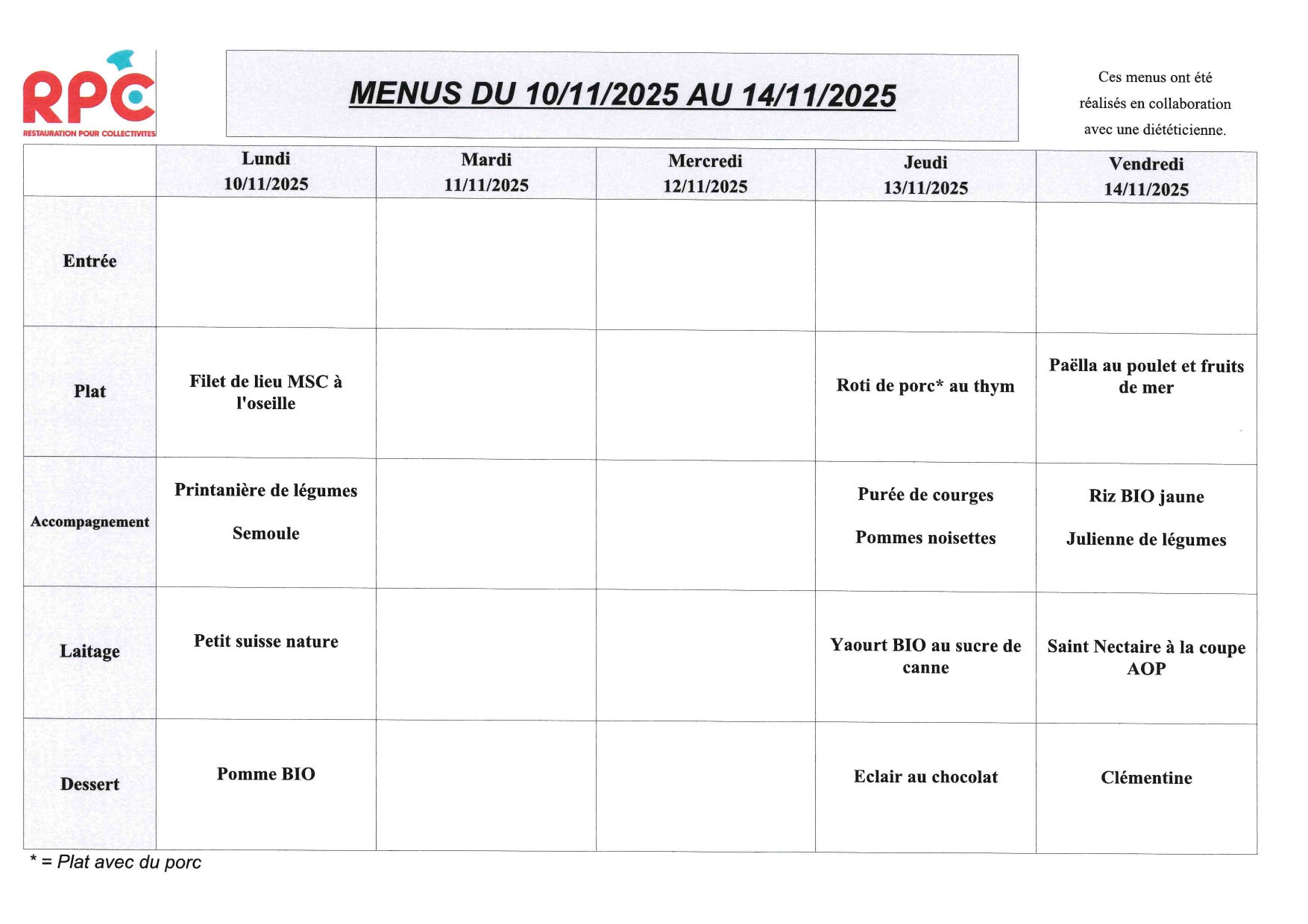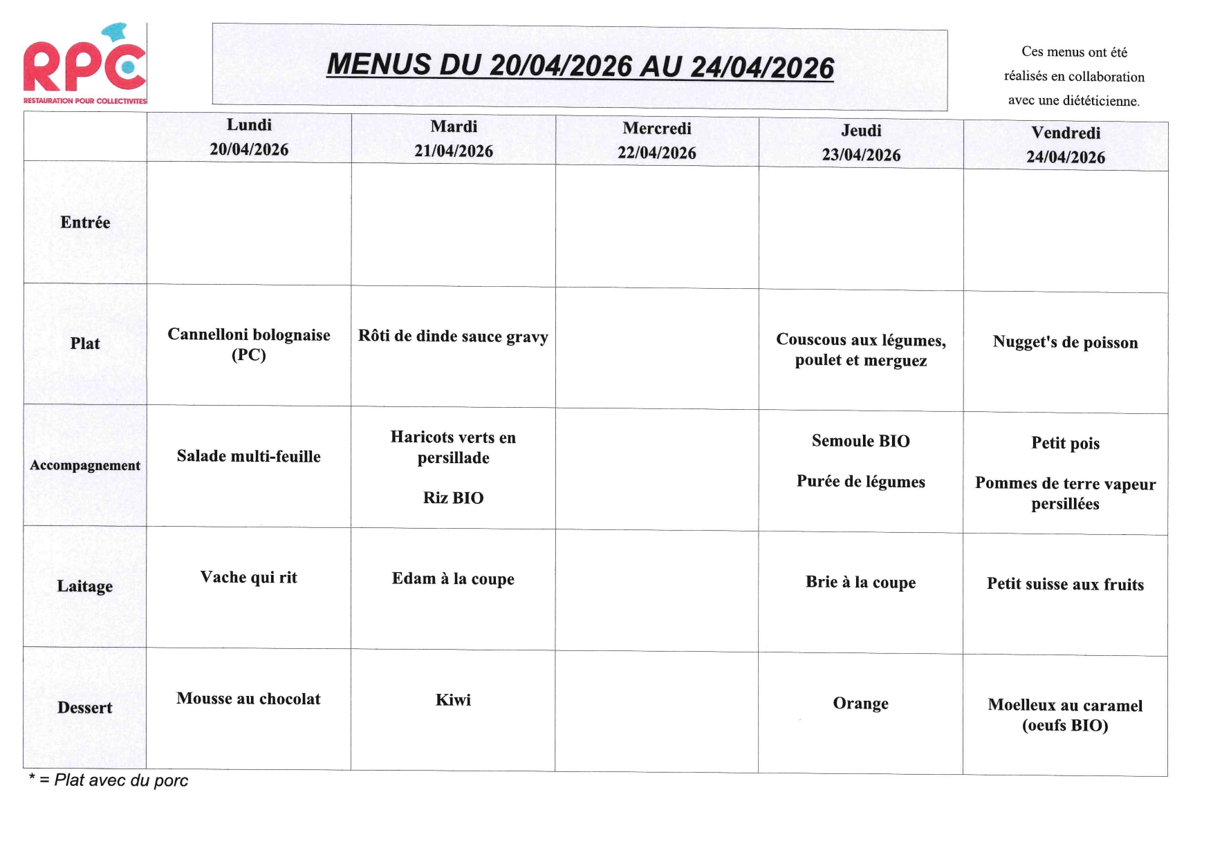 Le restaurant scolaire accueille vos enfants les lundis, mardis, jeudis et vendredis. Les repas sont élaborés à partir de produits frais par le prestataire RPC. - Côté prix