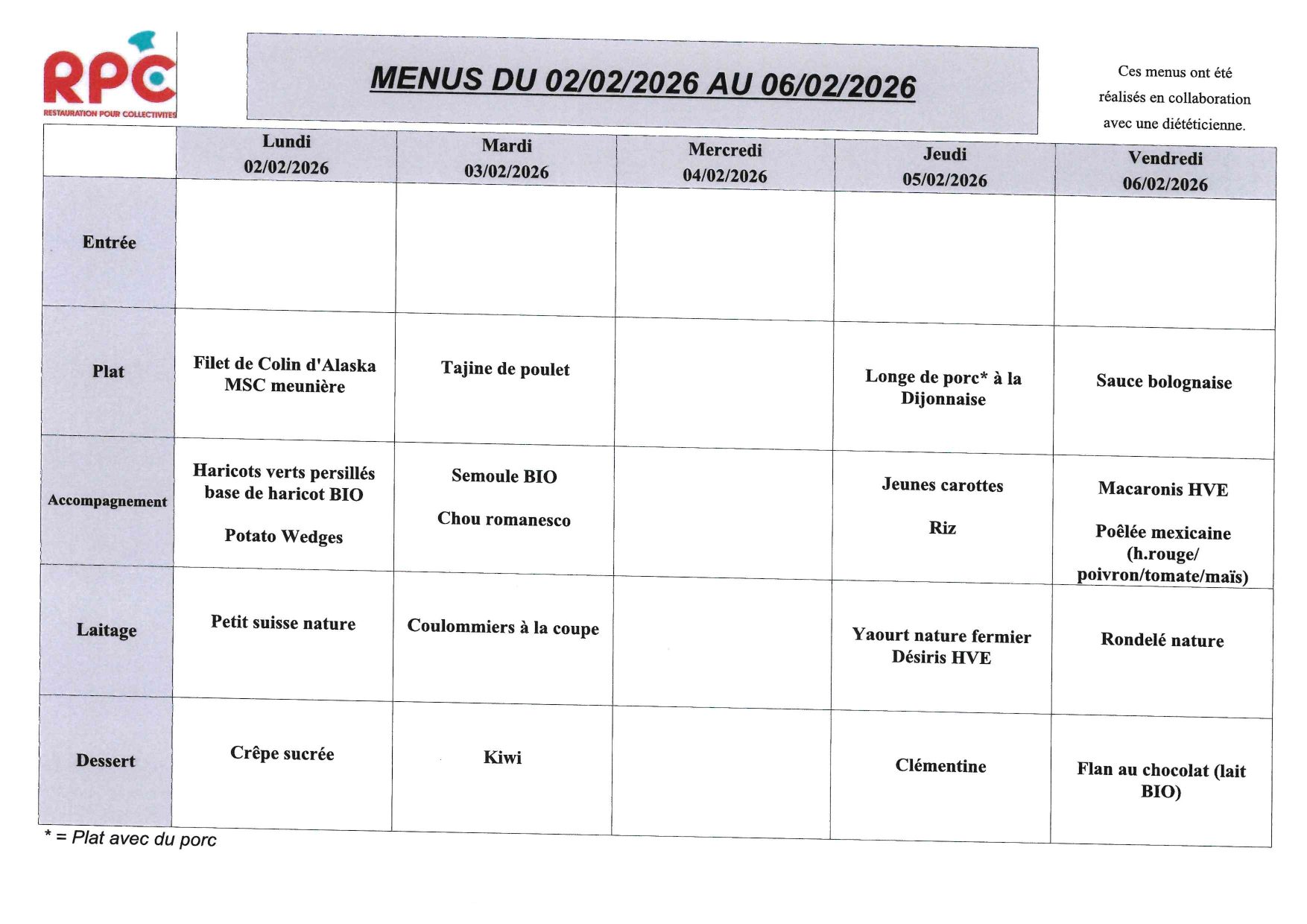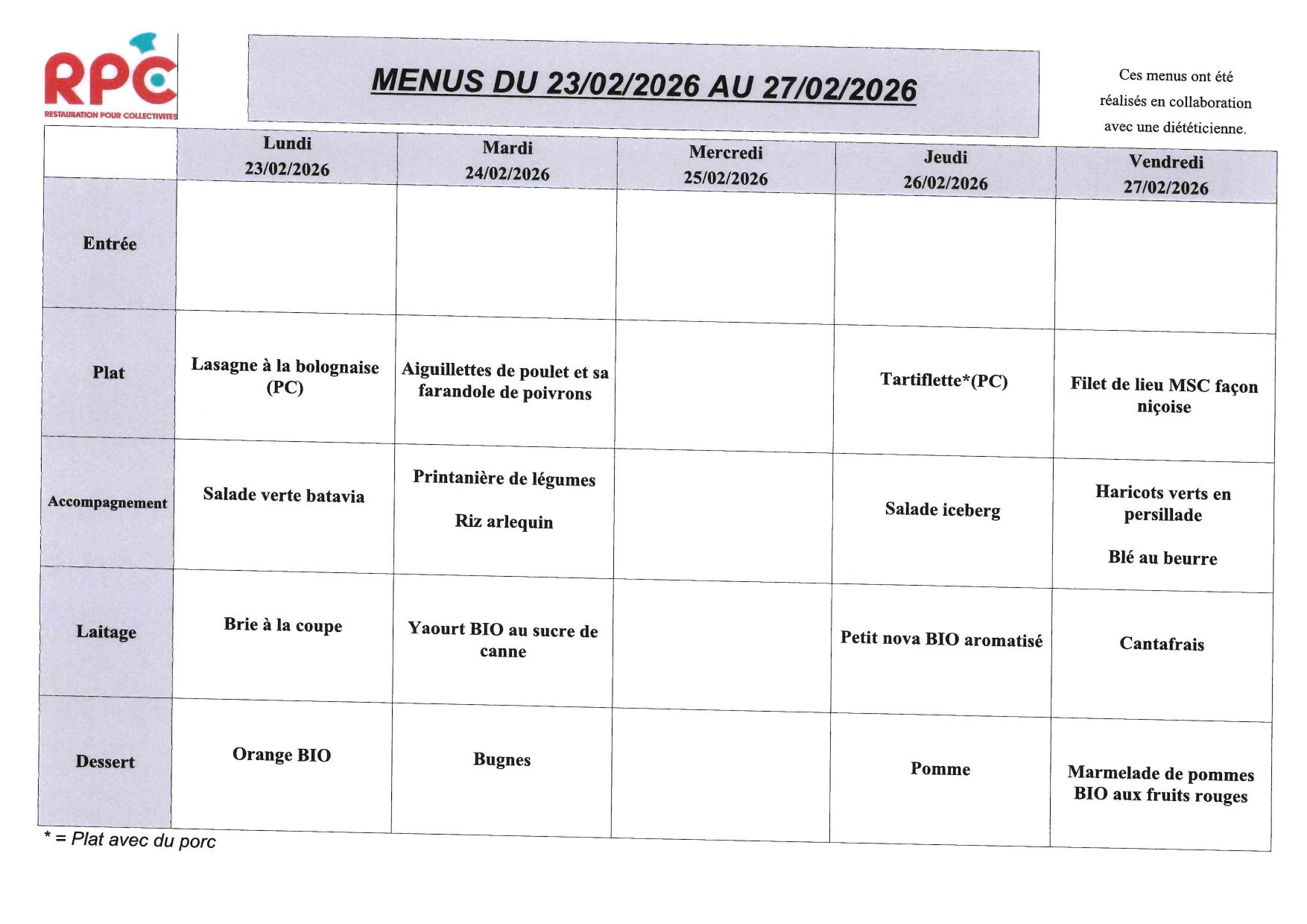 Le traiteur de la cantine nous propose un menu Bistrot pour les enfants. Cela consiste à ne plus servir d’entrée mais à étoffer le plat principal ou à rajouter un accompagnement à la viande ou au poisson. Cela permet d’alléger le service. Les menus restent équilibrés et suivis par une diététicienne.- Menus de janvier 2026: