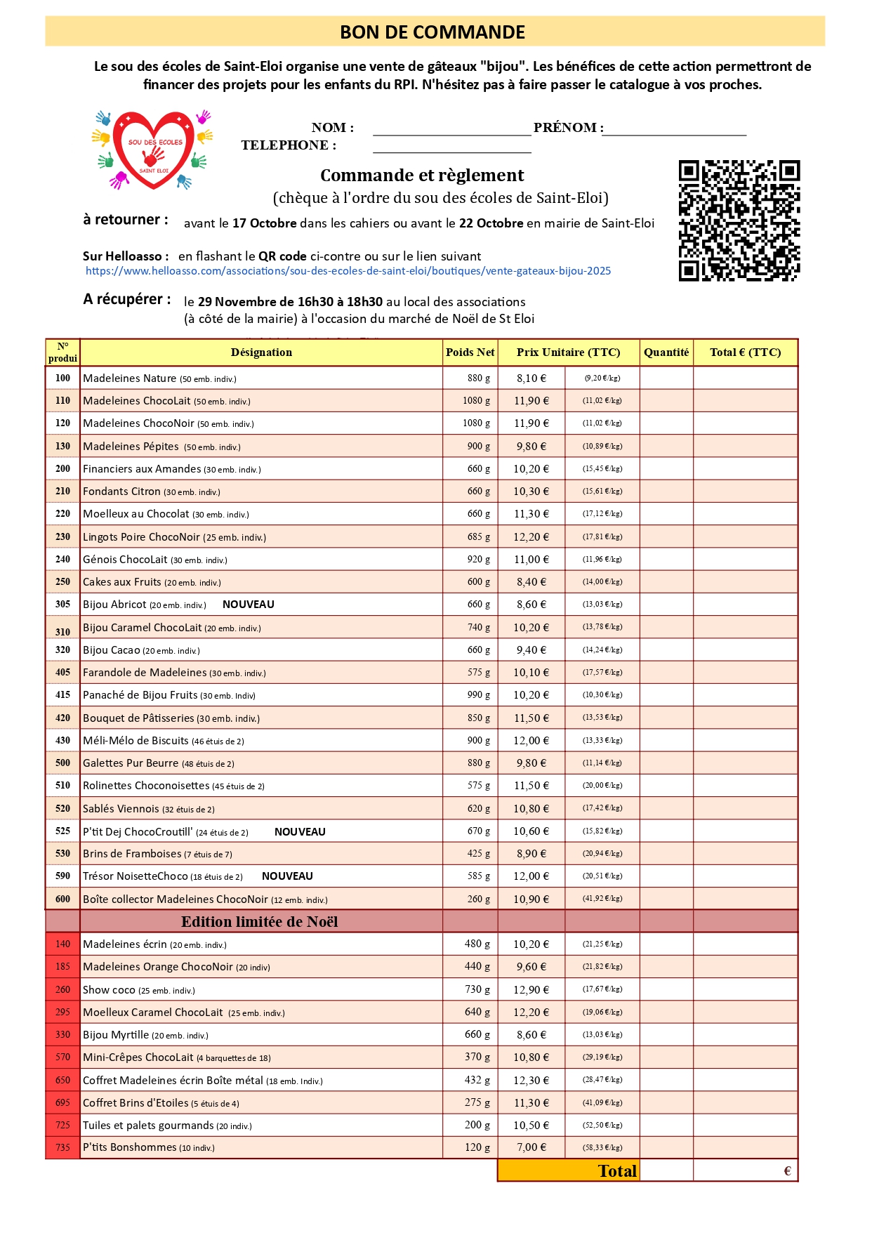 Le sou des écoles de Saint Eloi organise cette année encore, une vente de Gâteaux “Bijou”. Les bénéfices de cette vente serviront à financer du matériel et des projets pour les écoles du RPI.